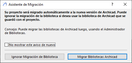 Si Archicad detecta que las bibliotecas utilizadas en el proyecto perteneces a versiones anteriores del programa, si te abrirá el Asistente de Migración un aviso como de la siguiente foto.