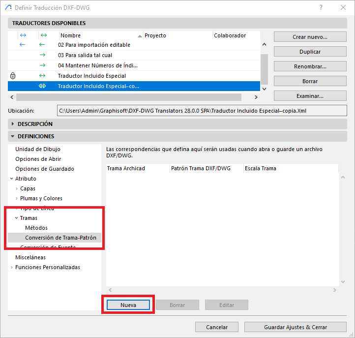 Para mapear las Tramas de Archicad a los archivos DXF-DWG: