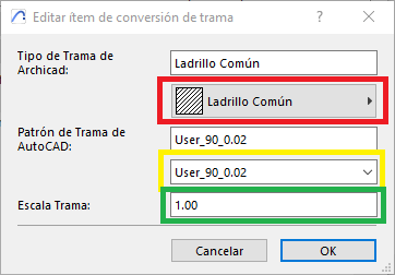 Tipo de Trama de Archicad (rojo): selecciona la Trama de Archicad.