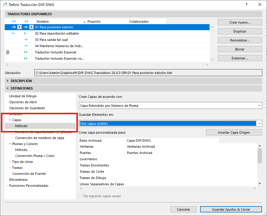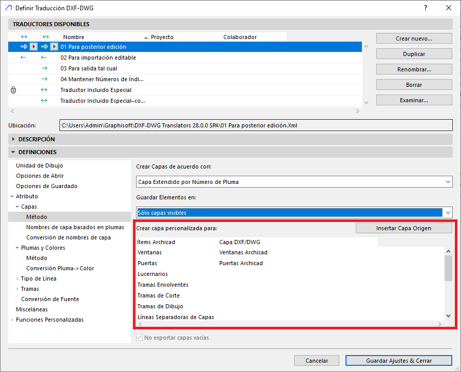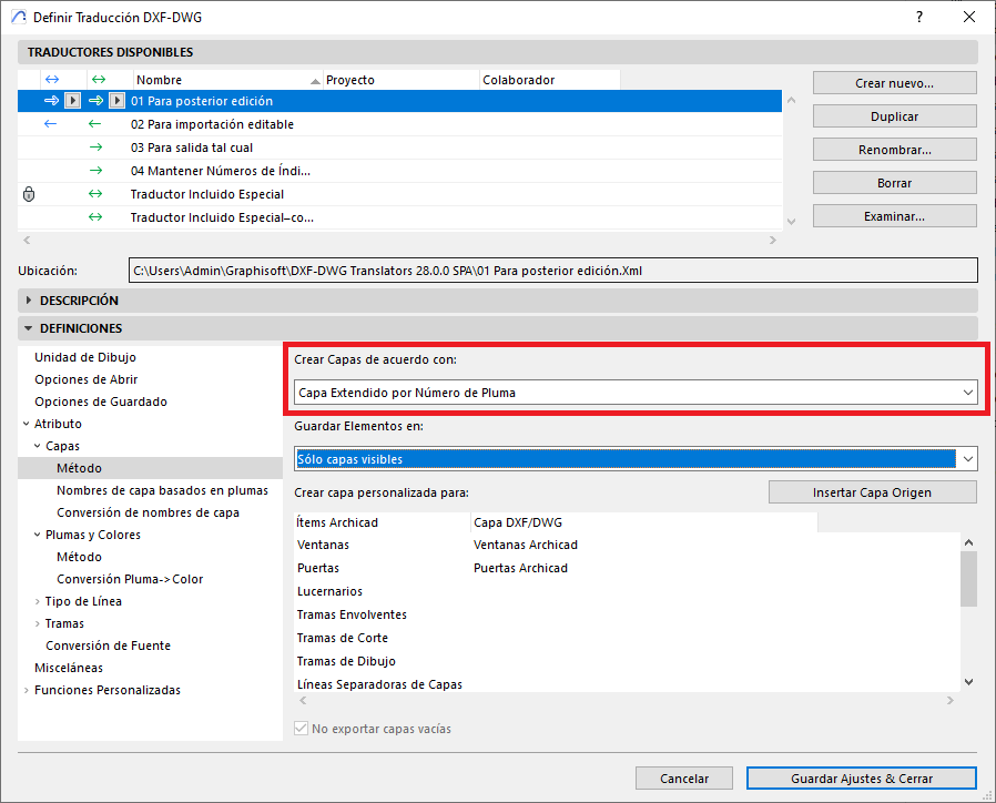 - No edites las configuraciones originales de los Traductores DXF-DWG que vienen por defecto con la instalación de Archicad.