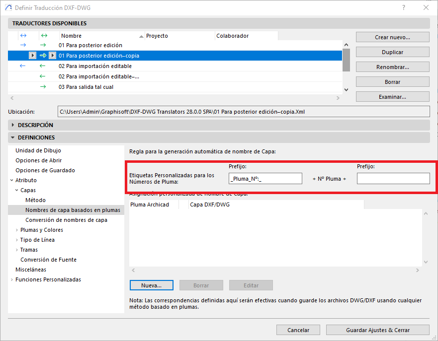 - En Etiquetas Personalizadas para los Números de Plumas: Permite especificar el formato del nombre de la Capas DXF-DWG con prefijos y sufijos