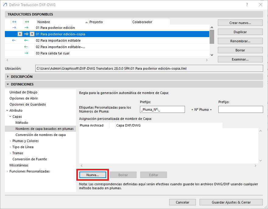 - Y para definir el criterio de conversión de Capas entre Archicad y los archivos DXF-DWG has clic sobre Nueva...