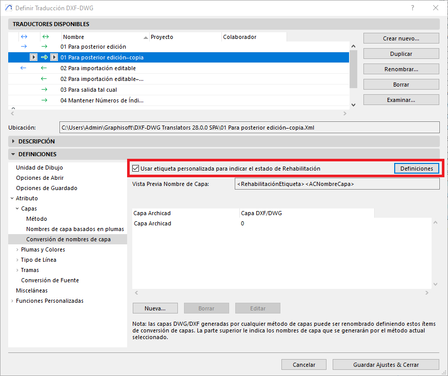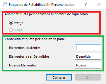 - En Usar etiqueta personalizada para indicar el estado de Rehabilitación, se define el criterio de nombramiento de las Capas DXF-DWG (etiqueta) para indicar fases de construcción de elementos de Archicad.