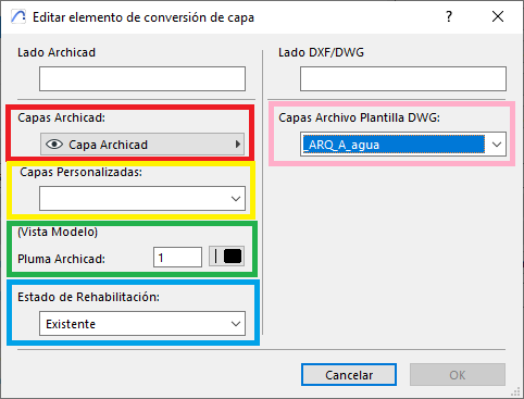 Capas Archivo Plantilla DWG (rosa): selecciona la capa DXF-DWG al que se debe asignarse los los elementos seleccionados según el criterio definido en Capas Archicad (rojo), Capas Personalizadas (amarillo), Pluma Archicad (verde), Estado de Rehabilitación (azul), y Capas Archivo Plantilla DWG (rosa).