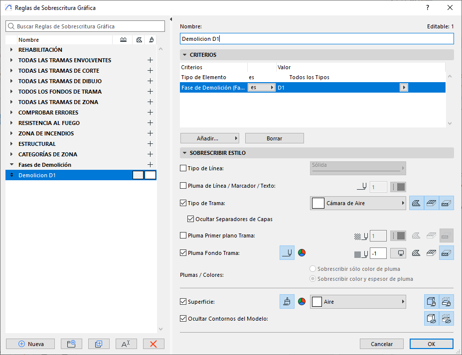 Una vez definidas las Propiedades en el Administrador de Propiedades, el siguiente paso es configurar las Reglas de Sobreescrituras Gráfica en la ventana de dialogo de Combinaciones de Sobreescrituras Gráficas. Estas reglas aparte de que se crearan según el criterio establecido establecido del paso 1, también nos permitirán visualizar los elementos según su estado. Ver la siguiente imagen como ejemplo de una Regla de Sobrescritura Gráfica para ocultar los elementos Demolidos del D1.
