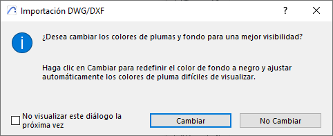 - Se te va a abrir el cuadro de dialog de Importación DWG/DXF, con el mensaje de que si quiere cambiar el color de fondo de la area de trabajo de Archicad y las plumas de las capas/elementos para que se asemejo a la configuración estándar del aspecto visual de los programas CAD. Selecciona