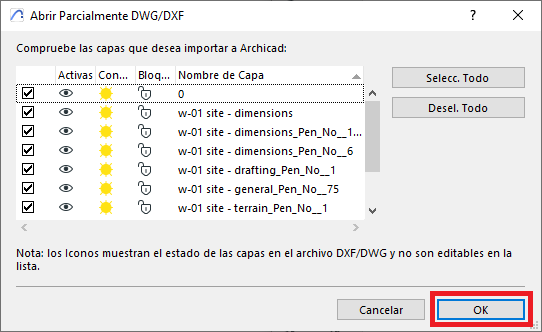 - Se te va abrir el cuadro de dialogo de Abrir Parcialmente DWG/DXF donde tendrás que seleccionar las capas que deseas importar (abrirlas) en Archicad, y al terminar haz clic sobre OK.