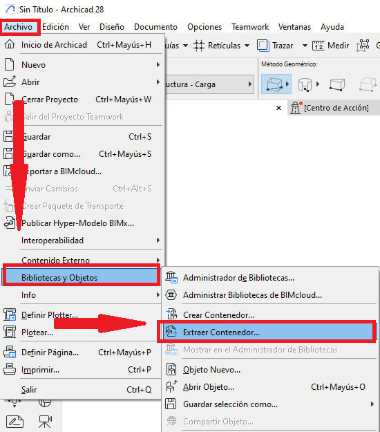 Sí. Archicad también permite extraer el contenido de un archivo .lcf si necesitas acceder o modificar los objetos. Para ello, ve a Archivo > Bibliotecas y Objetos > Crear/Extraer contenedor y selecciona la opción de extracción.