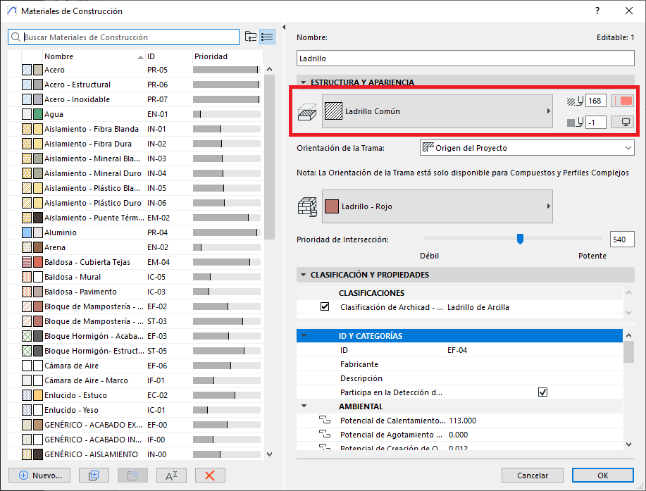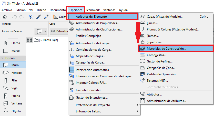 - Ir a Opciones > Atributos de Elemento > Materiales de Construcción.