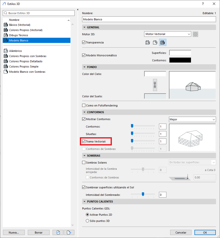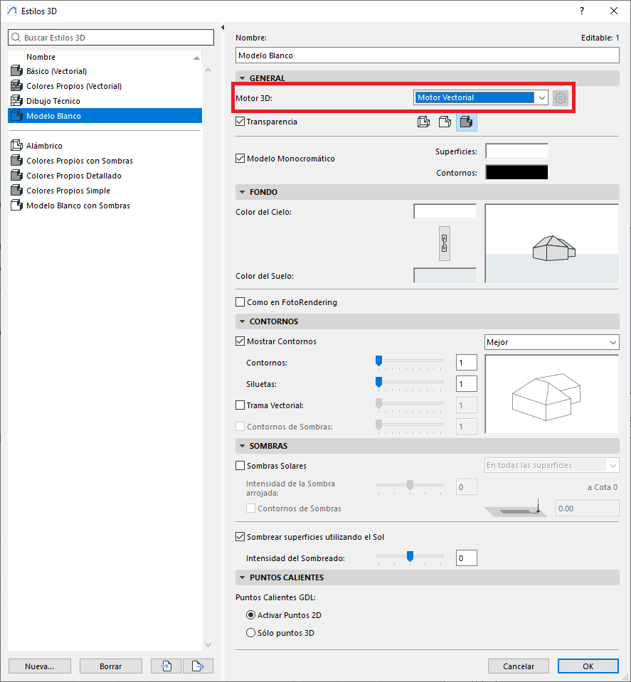 - En la ventana de dialogo Estilos 3D, revisa si el estilo utilizado esta utilizando el "Motor Vectorial".