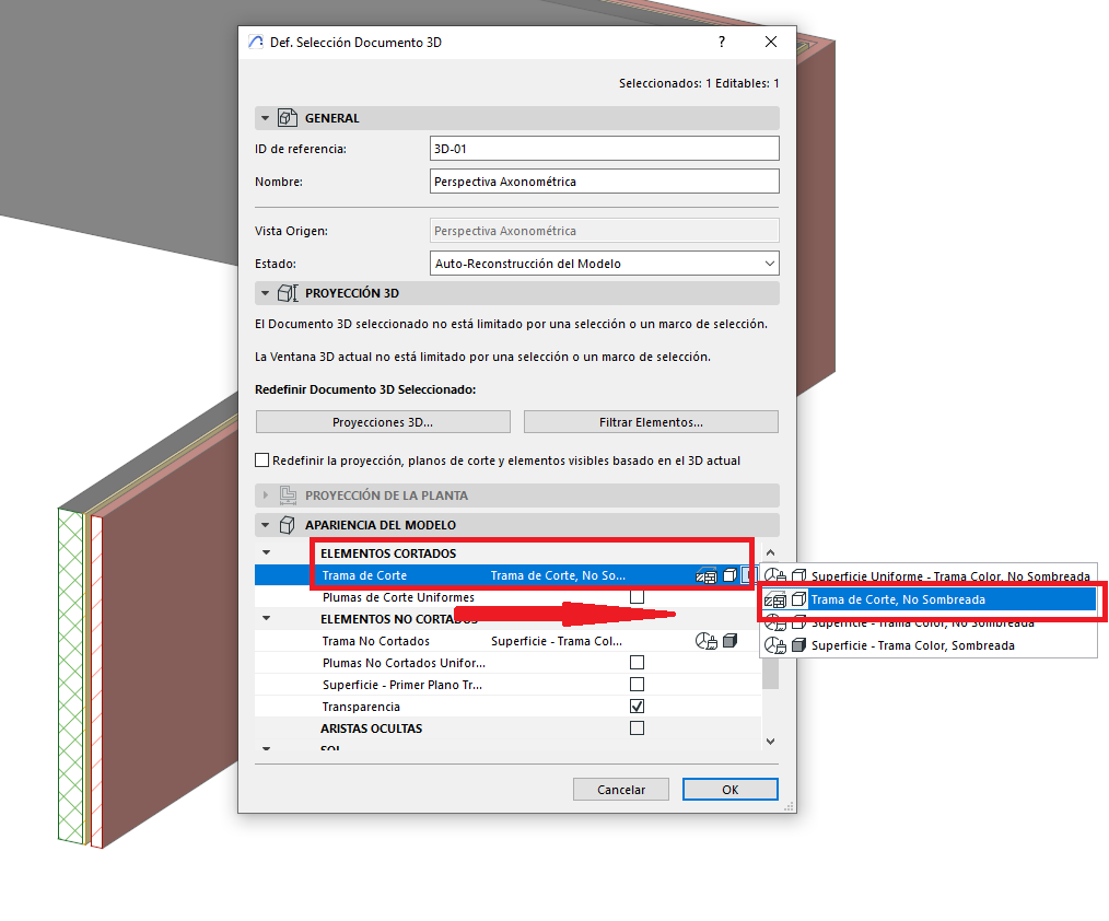 En el apartado Apariencia del Modelo > Elementos Cortados, seleccionar Trama de Corte, No Sombreada.