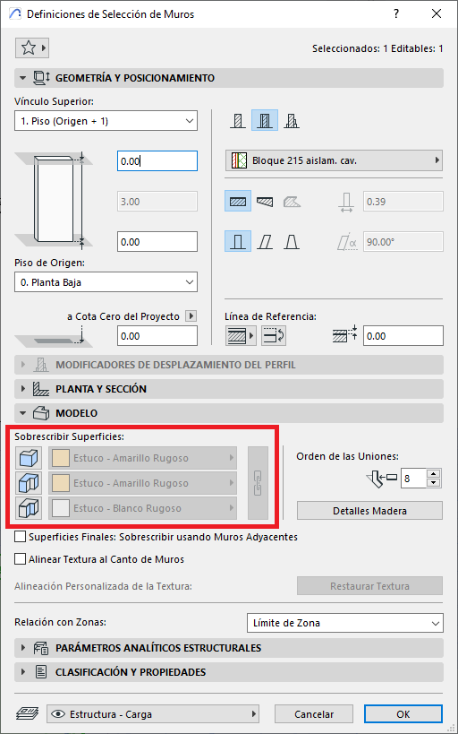 Algunos elementos pueden tener activada una superficie personalizada que impide la visualización del material de construcción.