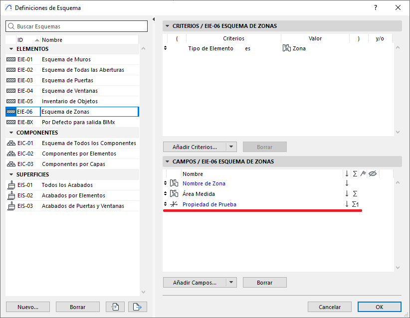 Tener una Propiedad definida y asignada a una categoría de elementos (por ejemplo, Zonas, Objetos, Muros).