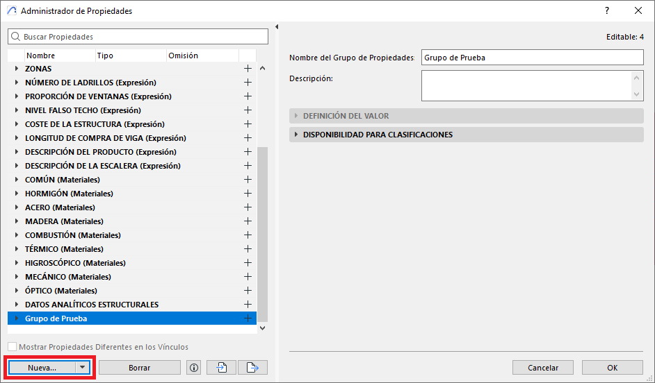 - En la ventana de dialogo de Nueva Propiedad / Grupo, seleccionamos Grupo, les asignamos un nombre descriptivo, por ejemplo "Grupo de Prueba”