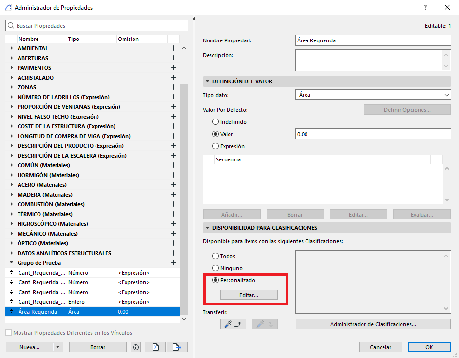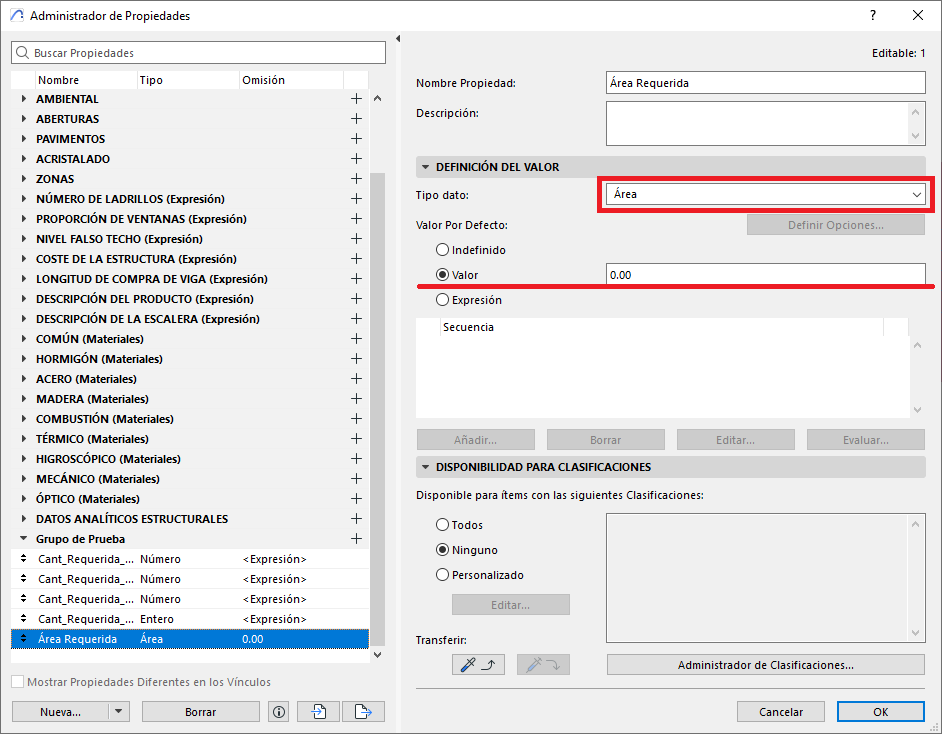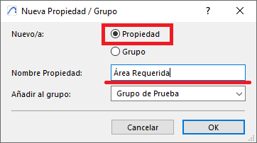 - En la ventana de dialogo de Nueva Propiedad / Grupo, seleccionamos Propiedad, les asignamos un nombre descriptivo, por ejemplo “Área Requerida”.