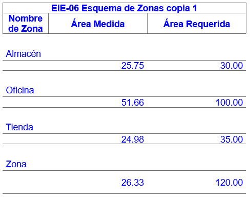 - Y veremos el esquema generado similar al siguiente, donde se vera la area medida de las Zonas en comparación de la área requerida por el proyecto