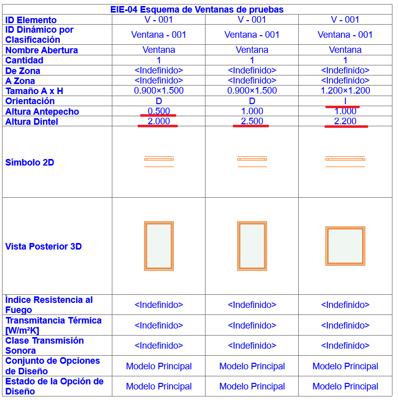 Al abrir la vista del Esquema Interactivo, se verá una vista similar al de la foto. y si lo observamos, veremos que en los campos marcados en rojo, se verá la razón o razones porque los elementos de Ventana con ID Elemento V-001, no se han combinado en una sola columna. Que en este ejemplo se puede deducir que es debido a: dirección de abertura, altura de antepecho, y la altura del dintel.