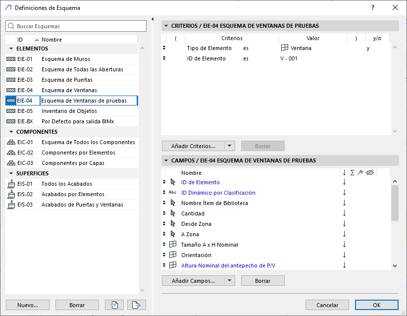 - Se te va abrir la venta de dialogo Definiciones de Esquema, y creamos el esquema de elementos con el Tipo de Elemento que se desea auditar, y para este ejemplo será el de ventanas con lo que va ser un esquema de elementos