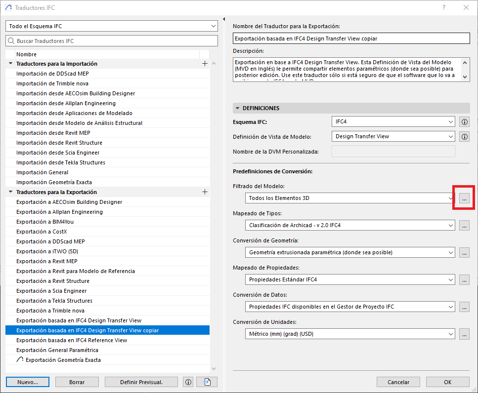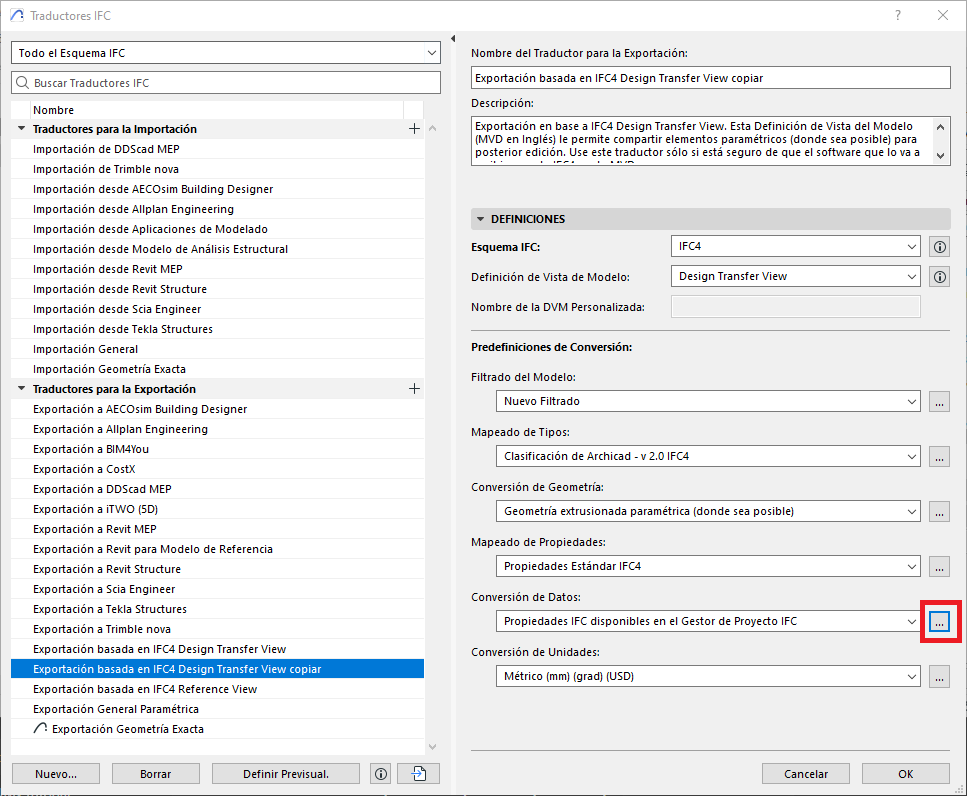 - En la ventana de dialogo de Traductores IFC, haz clic sobre los tres puntos de Conversion de Datos.
