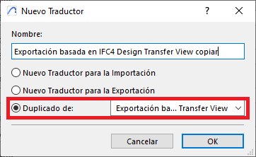 - En la ventana de dialogo de Nuevo Traductor, selecciona la opción de "Duplicado de" y asegúrate que el traductor a duplicar es el correcto.