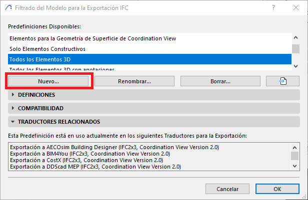 - En la ventana de dialogo de "Filtrado de Modelo para Exportación IFC", selecciona un tipo de filtro para crear un duplicado haciendo clic sobre Nuevo...