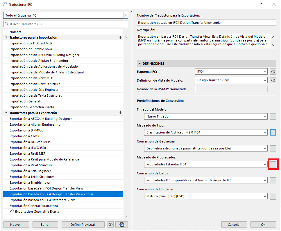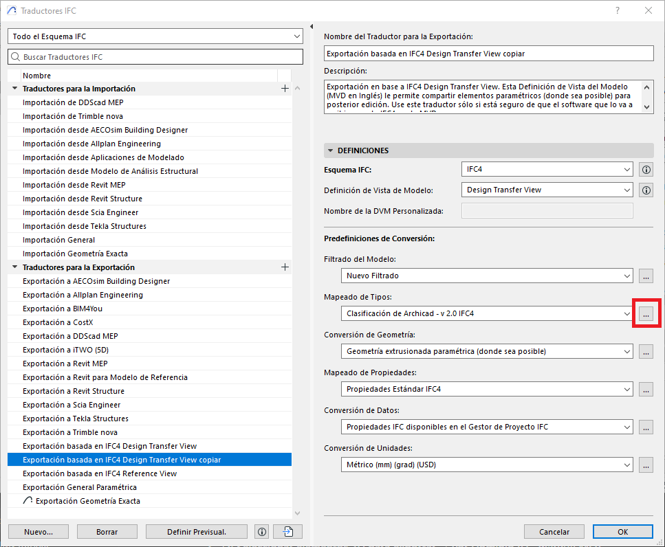 - En la ventana de dialogo de Traductores IFC, haz clic sobre los tres puntos en Mapeado de Tipos