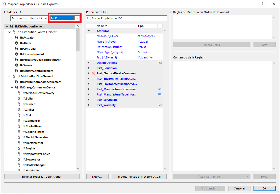 - En la ventana de dialogo de Mapear Propiedades IFC para Exportar, filtra los elementos IFC por MEP, y confirme que los conjuntos de propiedades necesarios (Psets) están incluidos. Al terminar haz clic sobre OK.