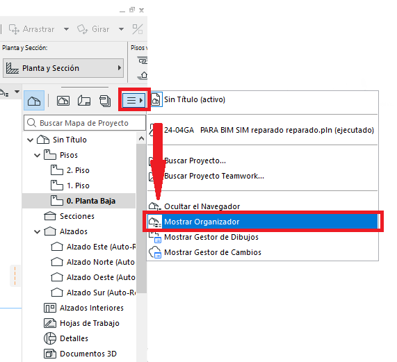 El Gestor de Dibujos es un panel de administración de todos los dibujos que se han colocado dentro del proyecto, ya sea que provengan de vistas internas de Archicad o de fuentes externas (como archivos DWG, PDF, JPG, etc.).