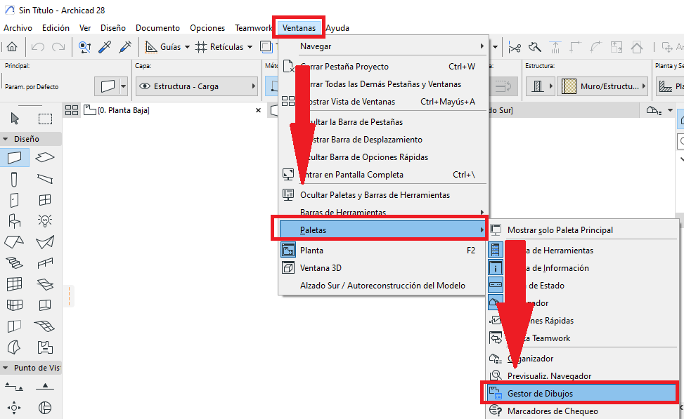 - Menú: Ventana > Paletas > Gestor de Dibujos