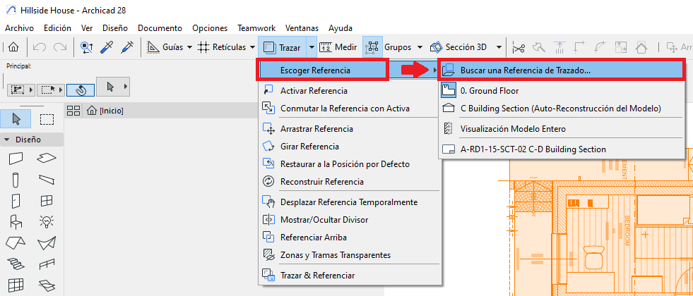 Haz clic en la flecha desplegable y selecciona Escoger Referencia > Buscar una Frederica de Trazado...