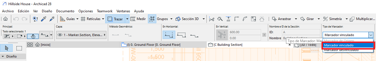 En proyectos complejos, puede ser útil visualizar los Marcadores de Sección directamente en las Vistas de Secciones o de Alzados. Esto permite ubicar gráficamente la posición de cortes dentro del modelo y acceder rápidamente a las vistas relacionadas. Archicad ofrece un procedimiento sencillo para lograrlo mediante Marcadores Vinculados.