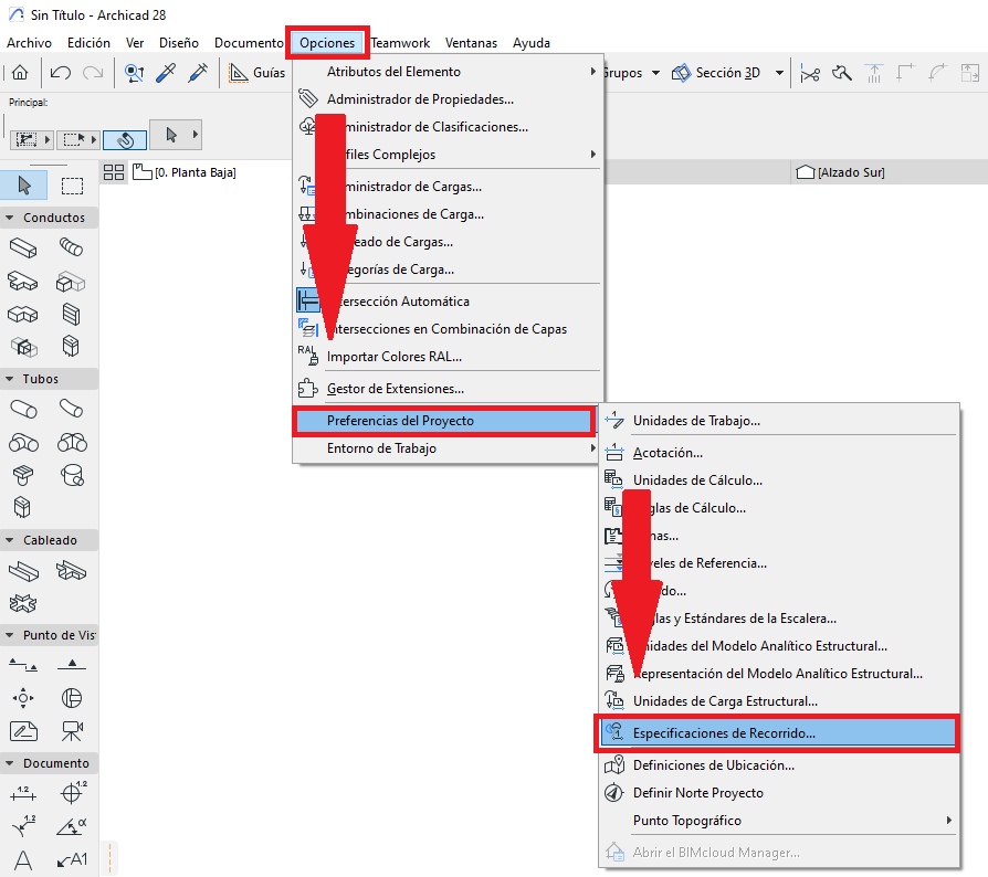 Ir al menú superior: Opciones > Preferencias del Proyecto > Especificaciones de Recorrido...