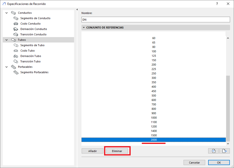 - Para eliminar una dimension existente en el Conjunto de Referencia, selecciona una dimension de referencia y pulsa Eliminar.