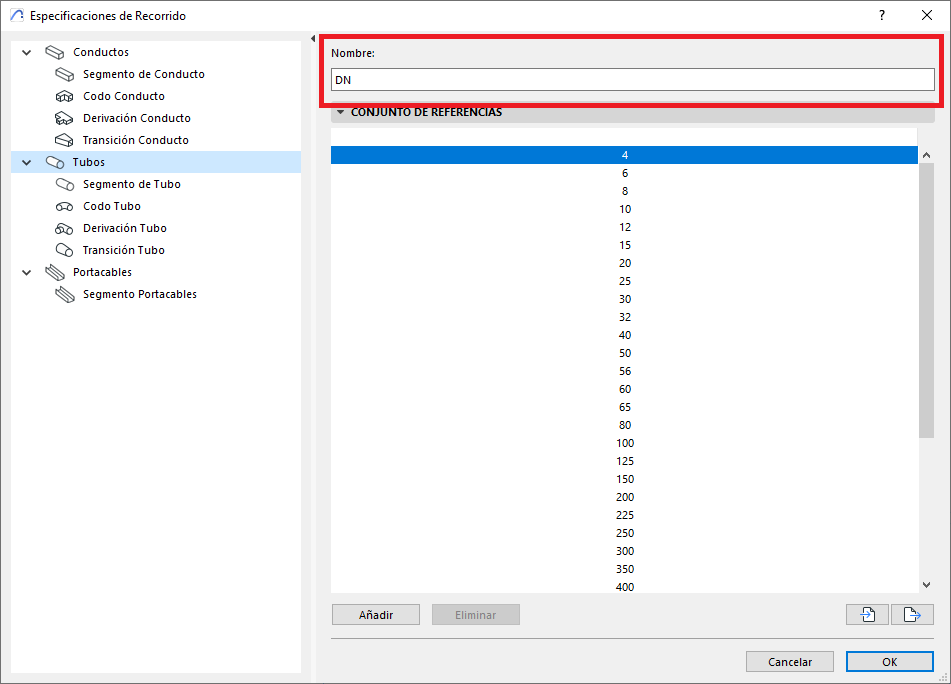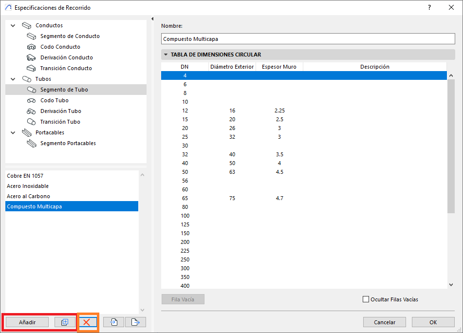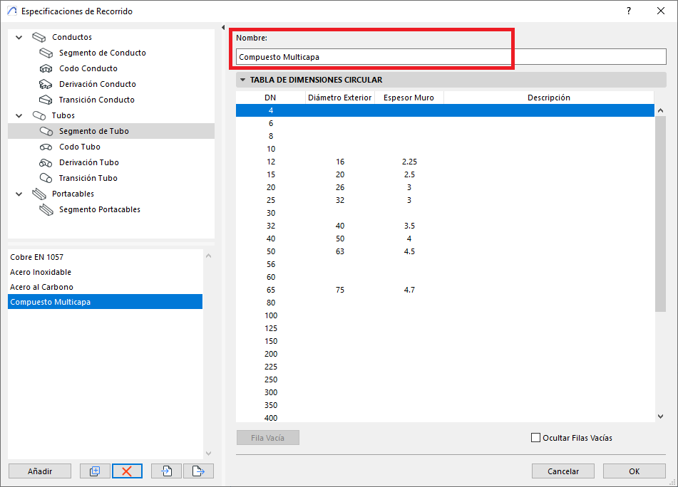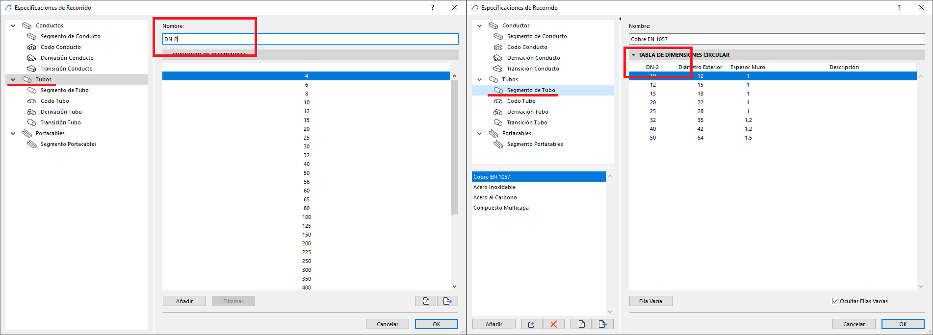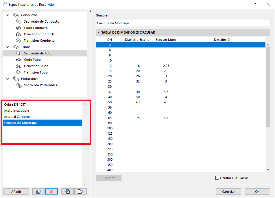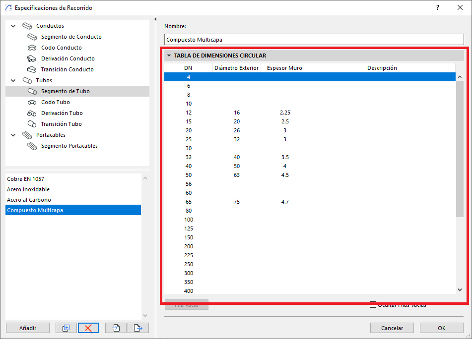 - En el panel inferior (ver foto), el tipo de derivación podrá tener diferentes dimensiones de la listas de dimensiones proporcionadas por el Conjunto de dimensiones. Y esas dimensiones se pueden especificar por criterios pre definidos, como por ejemplo (ver foto), los Segmentos de Tubos pueden disponer de dimensiones especificas por tipo de material.