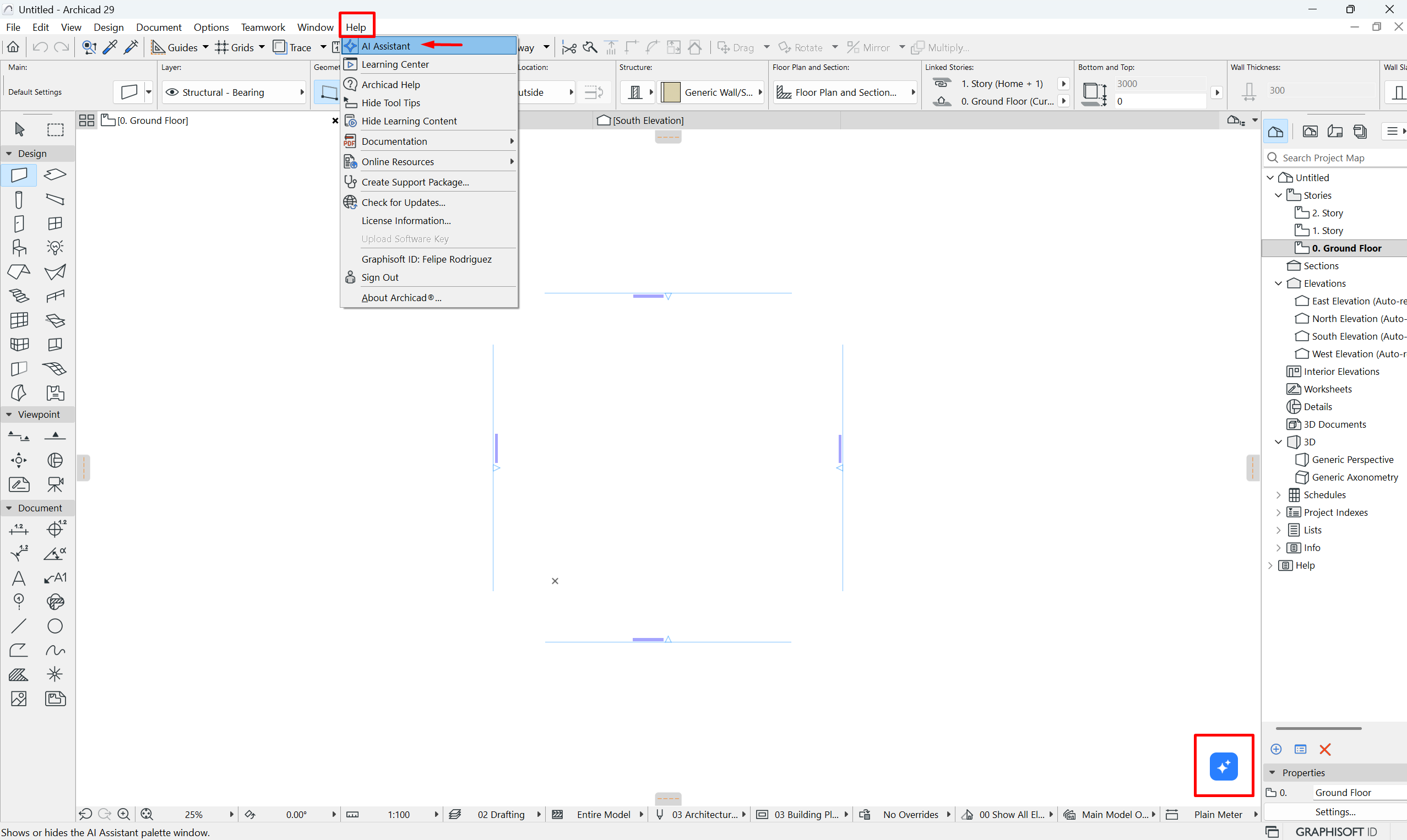 - Haz clic en el botón de acción situado en la esquina inferior derecha de Archicad 29.
