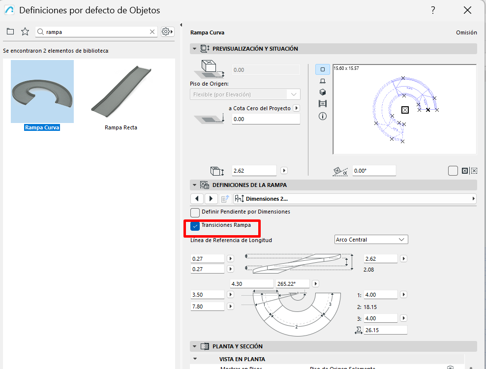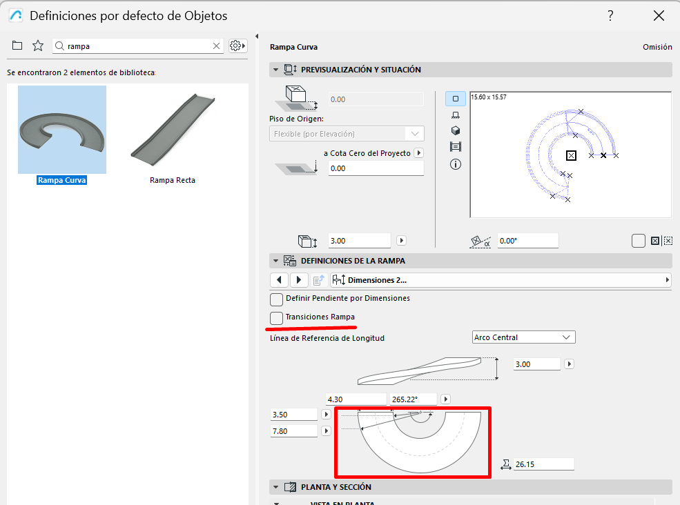 - Con la Rampa Curva seleccionada, revisa los parámetros de Geometría: