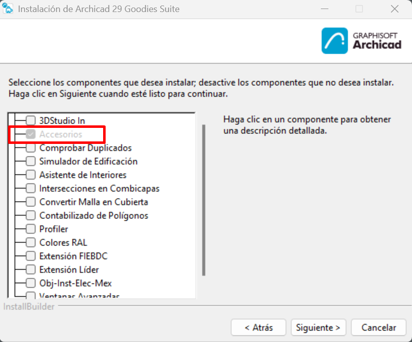 Ejecuta el instalador y, en la lista de componentes disponibles, selecciona el Add-On Accesorios (de Muro/Cubierta/Forjado).