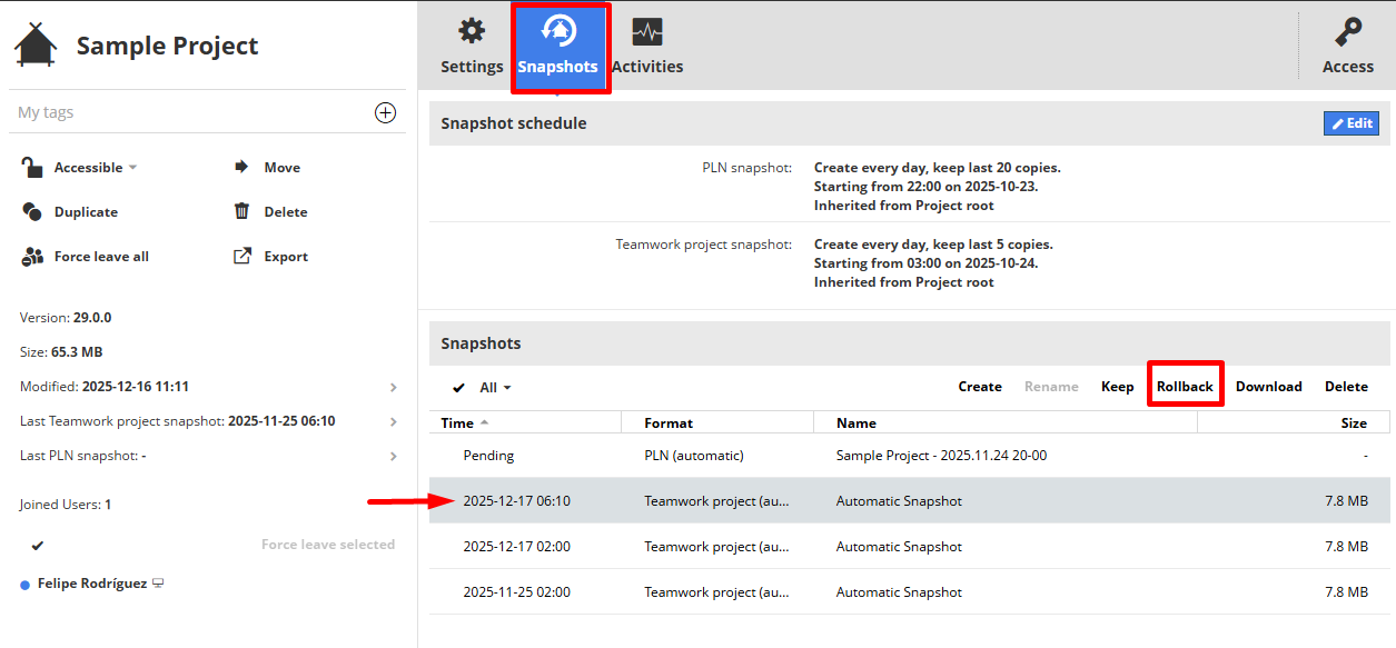 Nota: Al restaurar una instantánea, el proyecto se devuelve exactamente a ese estado y se eliminan todos los cambios realizados con posterioridad. Los usuarios deberán volver a unirse al proyecto.
