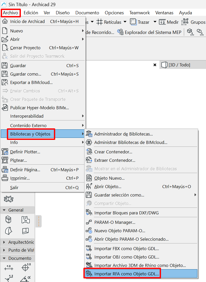 Ve a Archivo > Bibliotecas y Objetos > Importar RFA como Objeto GDL.