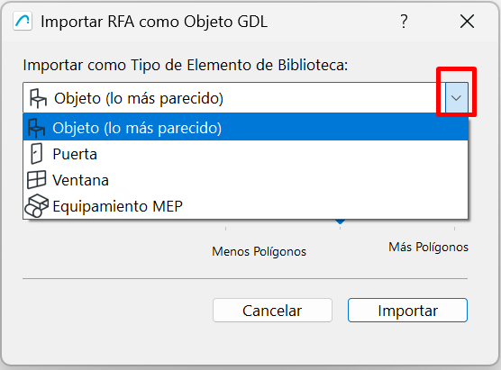 En el cuadro de diálogo Importar RFA como Objeto GDL, configura las opciones de importación según tus necesidades.