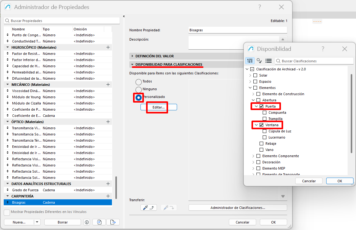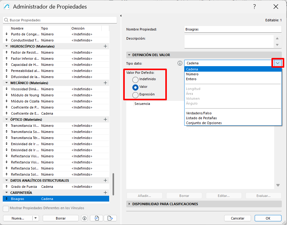 Si la propiedad no aparece, normalmente significa que su disponibilidad se definió para otro tipo de elemento o para otra clasificación distinta.